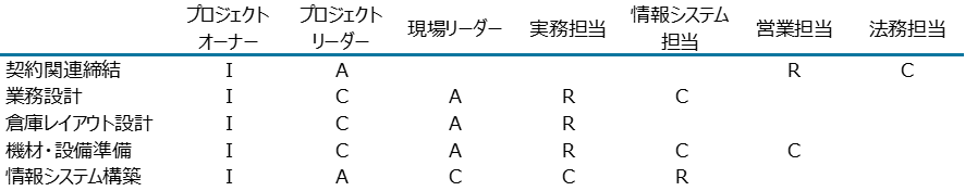 事例として新規荷主の保管および入出庫業務の立ち上げを例にRACIチャートの一例を示します。